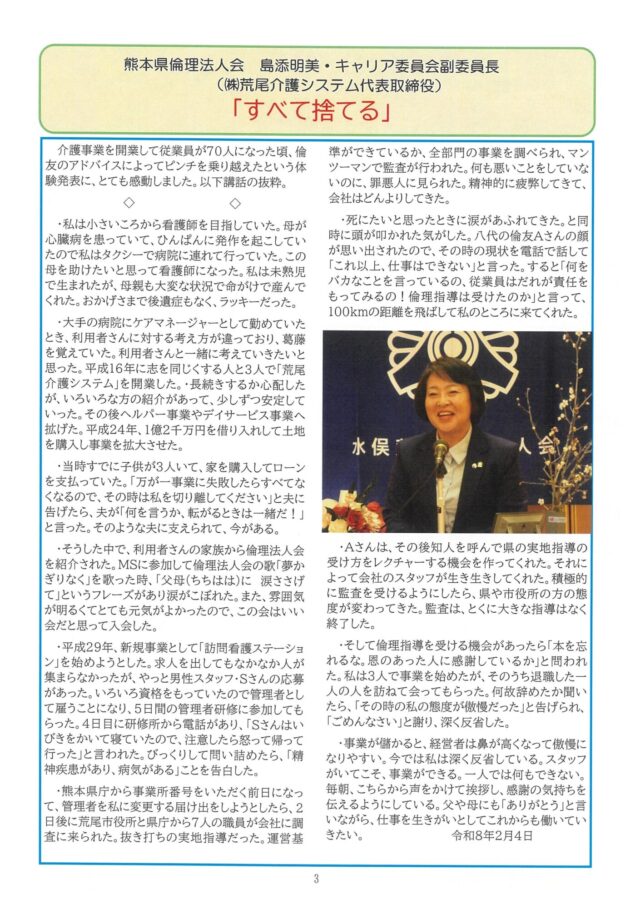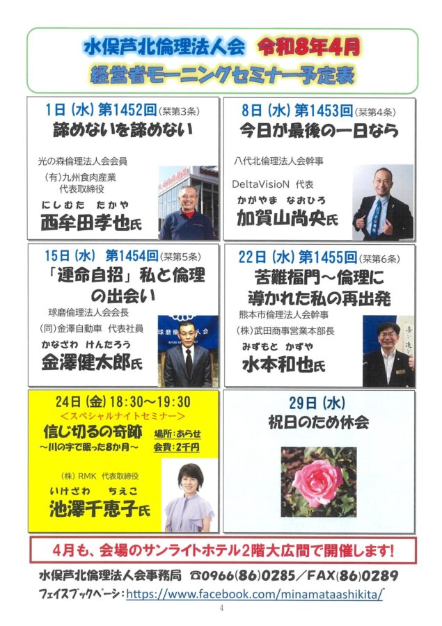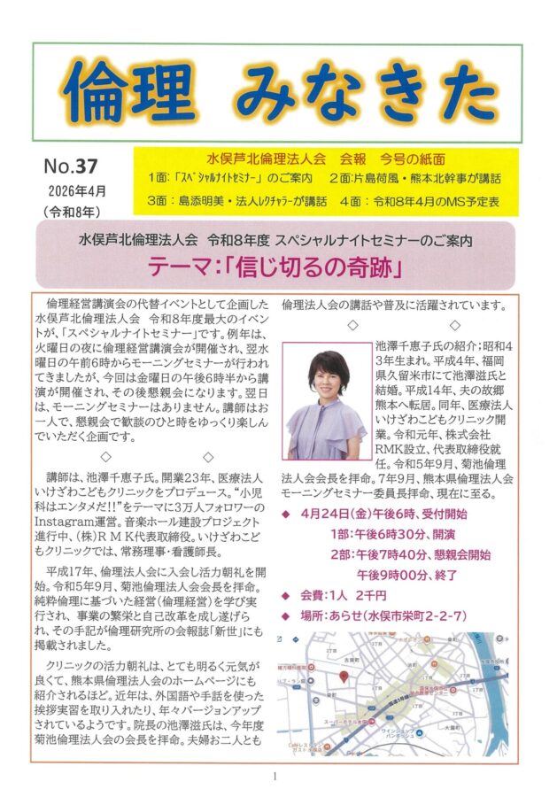 水俣芦北倫理法人会の会報誌「倫理みなきた」令和8年4月号(No37)が発行されました。当会では、4月24日(金)午後6時半から水俣市・あらせにて「スペシャルナイトセミナー」が行われます。倫理経営講演会の代替行事として開催するもので、金曜日夜に一人の講師をお招きして講演会を開催し、その後講師を中心に懇親会を行います。講師は、倫理経営で事業の発展と成長を成し遂げ、夫婦で倫理運動に活躍されている(一社)倫理研究所の池澤千恵子・法人レクチャラー(いけざわこどもクリニック常務理事)です。4ページ目に、4月予定表を掲載しています。ご期待ください。