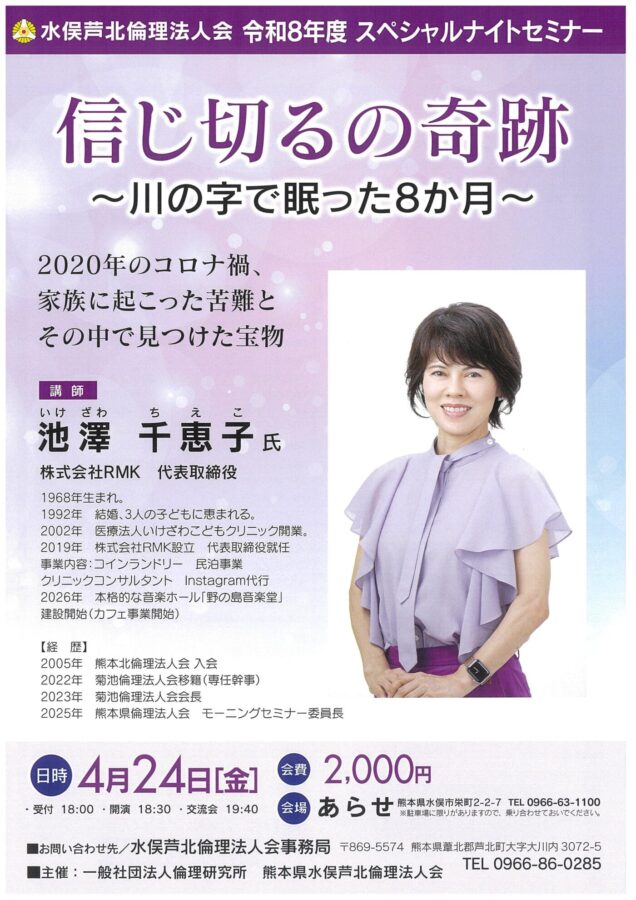 倫理経営講演会の代替イベントとして企画した水俣芦北倫理法人会 令和8年度最大のイベントが、「スペシャルナイトセミナー」です。例年は、火曜日の夜に倫理経営講演会が開催され、翌水曜日の午前6時からモーニングセミナーが行われてきましたが、今回は4月24日(金曜日)の午後6時半から講演が開催され、その後懇親会になります。翌日は、モーニングセミナーはありません。講師はお一人で、懇親会で歓談のひと時をゆっくり楽しんでいただく企画です。