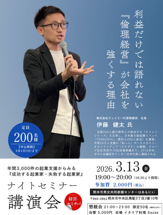 カテゴリー #N/A 上天草倫理法人会 人吉市倫理法人会 光の森倫理法人会 八代中央倫理法人会 八代北倫理法人会 八代南倫理法人会 八代市倫理法人会 合志市倫理法人会 天草倫理法人会 宇土市倫理法人会 宇城倫理法人会 山鹿市倫理法人会 水俣芦北倫理法人会 水前寺倫理法人会 熊本北倫理法人会 熊本市中央倫理法人会 熊本市倫理法人会 熊本市南倫理法人会 熊本市西倫理法人会 熊本市託麻倫理法人会 熊本東倫理法人会 玉名倫理法人会 玉名南倫理法人会 球磨倫理法人会 経営者の集い 荒尾市倫理法人会 菊池倫理法人会 菊池市倫理法人会 阿蘇倫理法人会 アジェンダ アジェンダ 日 月 週 3月 2026 3月 2026 すべて閉じる すべて開く 3月 13 金 ナイトセミナー講演会 チケット 3月 13 @ 7:00 PM – 8:00 PM 3月 2026 3月 2026 絞り込んだカレンダーを購読 Timely カレンダーに追加 Google に追加 Outlook に追加 Apple カレンダーに追加 他のカレンダーに追加 XML ファイルとしてエクスポート